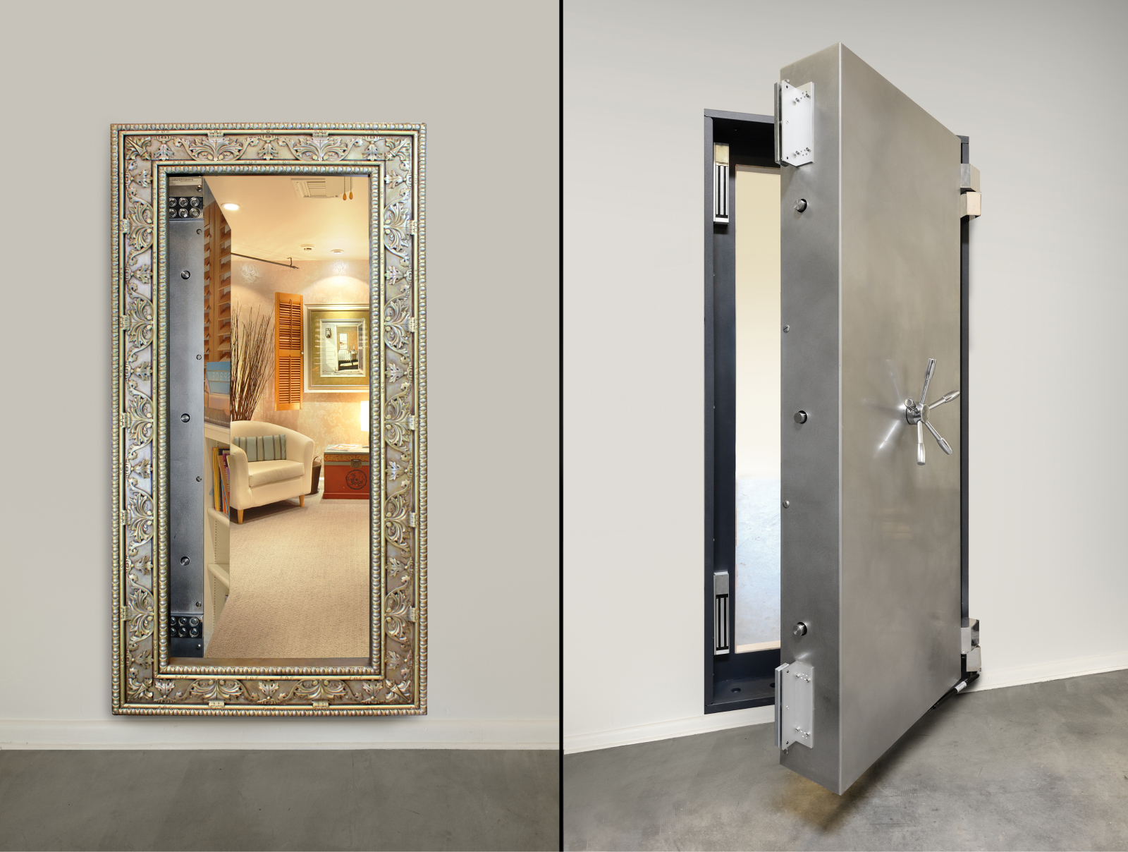 Vault style bulletproof door with 1″ steel shear pins. Electromagnetic locking system.