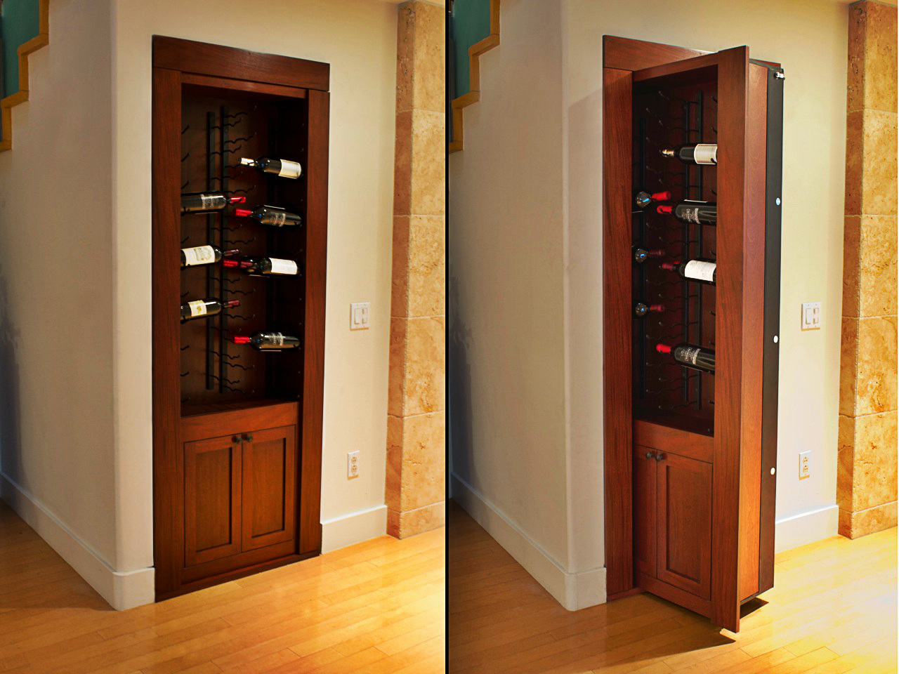 This secret wine rack door was custom fabricated for a wine enthusiast who also wanted a high security location for his valuables and, more importantly, his family. The client has a collection of rare and exotic wines. While he displayed numerous wine bottles in the door rack itself, his most prized collectible bottles were stored in his secret wine room covered by our covert wine rack door.